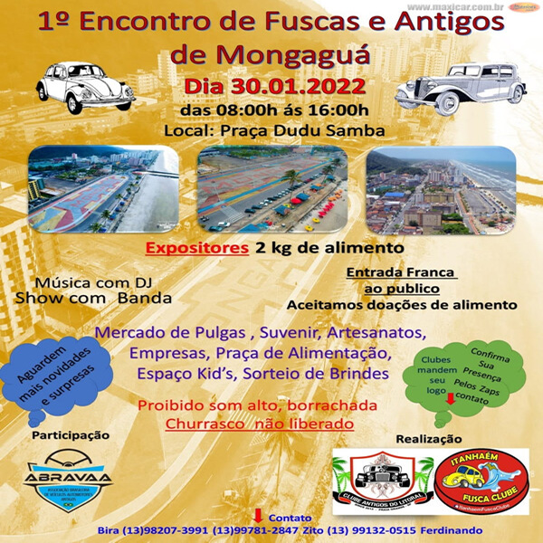 1º Encontro de Fuscas e Antigos de Mongaguá 30 de janeiro de 2022 – Domingo Praça Dudu Samba A partir das 8h às 16h Bira (13)98207-3991 / Zito (99781-2847 / Ferdinando (13)99132-0515