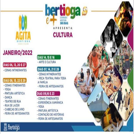 O verão no litoral será marcado por diversas atrações. O “Agita Bertioga Cultura” é exemplo disso e vai movimentar o mês de janeiro na cidade, entre os dias 5 e 29, com uma extensa programação gratuita e aberta ao público. As pessoas poderão curtir oficinas de palhoterapia, pintura, yoga, teatro e muito mais.