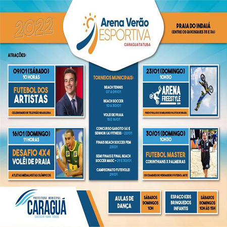 A Prefeitura de Caraguatatuba promove no início do ano que vem, as emoções do Arena Verão 2022. A estrutura do evento será montada na praia do Indaiá, na Av. Arthur da Costa Filho, mais precisamente entre os quiosques 35 e 36. O espaço contará com iluminação especial, arquibancadas cobertas, palco, vestiário e sanitários. O Arena Verão acontece entre os dias 08 e 30 de janeiro.
