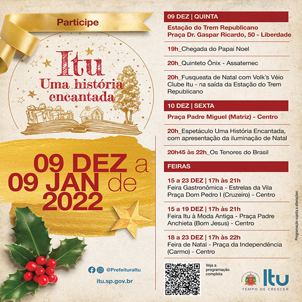 Serão 18 apresentações de orquestras, bandas e artistas até o dia 2 de janeiro. O cronograma terá shows, parada de Natal, festival gastronômico com food trucks e iluminação temática em praças da cidade.