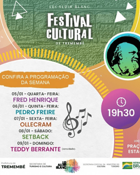 A partir desta quarta-feira (05), a Prefeitura de Tremembé inicia o 1° Festival Cultural da cidade com apresentações de grandes talentos culturais do município.